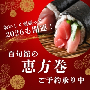 たべごろ百旬館 渡辺通本店では、2026年度の「恵方巻」の予約を承ります。百旬館自慢の鮮魚をぎっしり巻いた恵方巻は予定数に達した場合は予定よりも早く受付を終了する場合がございますので、お早目にご検討ください。 (お客さま…