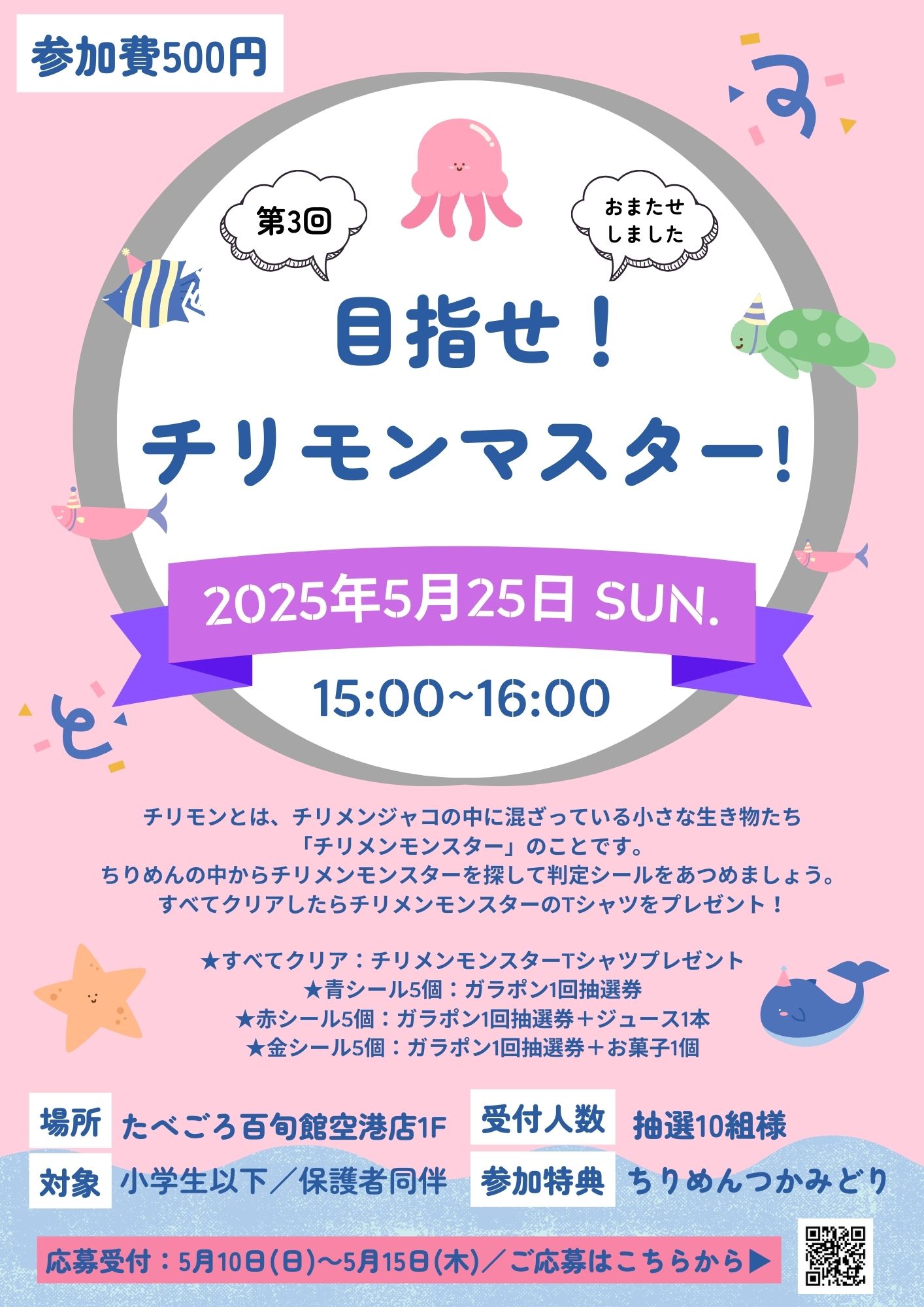 たべごろ百旬館 空港店では5月25日(日)、親子で一緒に楽しめる食育イベント「目指せ!チリモンマスター!」の第3回目を開催いたします。今回は先着順ではなく、事前のご応募が必須となり、ご応募が多い場合は抽選となりますので予めご了承くださいませ。