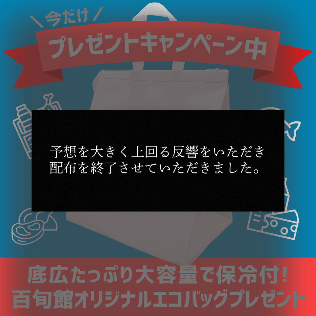 LINE友だち追加特典「百旬館オリジナルエコバッグ」は、予想を大きく上回る反響をいただき配布を終了させていただきました。楽しみにされていたお客様にはご迷惑をおかけし心よりお詫び申し上げます。なお、代わる特典として「めんたいポテトチップス」をプレゼントさせていただきます。引き続きご愛顧のほど、何卒よろしくお願い申し上げます。