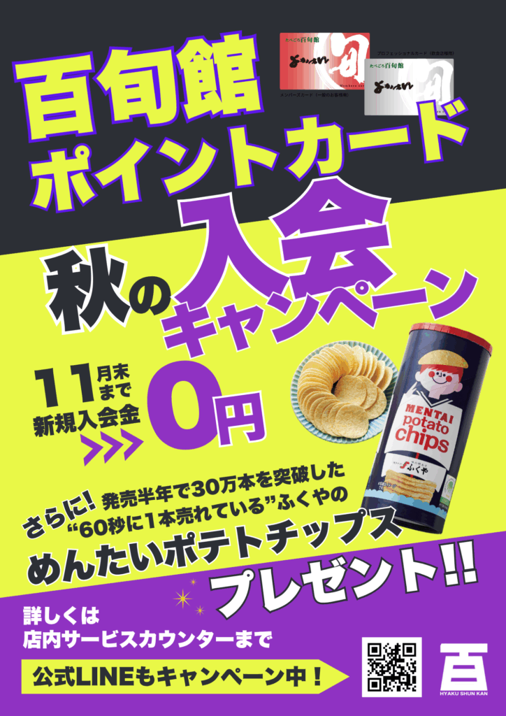 ご入会特典として新規入会金が無料、さらにふくやのめんたいポテトチップスをおひとつプレゼントいたします。今月は創業祭も開催され、ポイントの倍率も高くなりますのでこの機会に是非ご入会ください!
