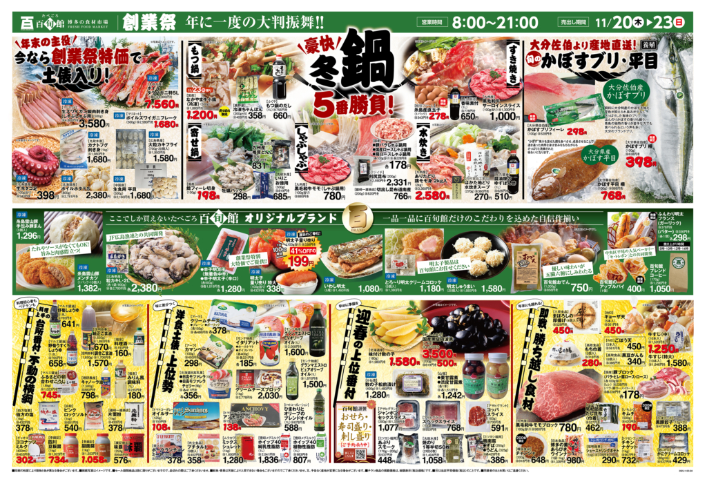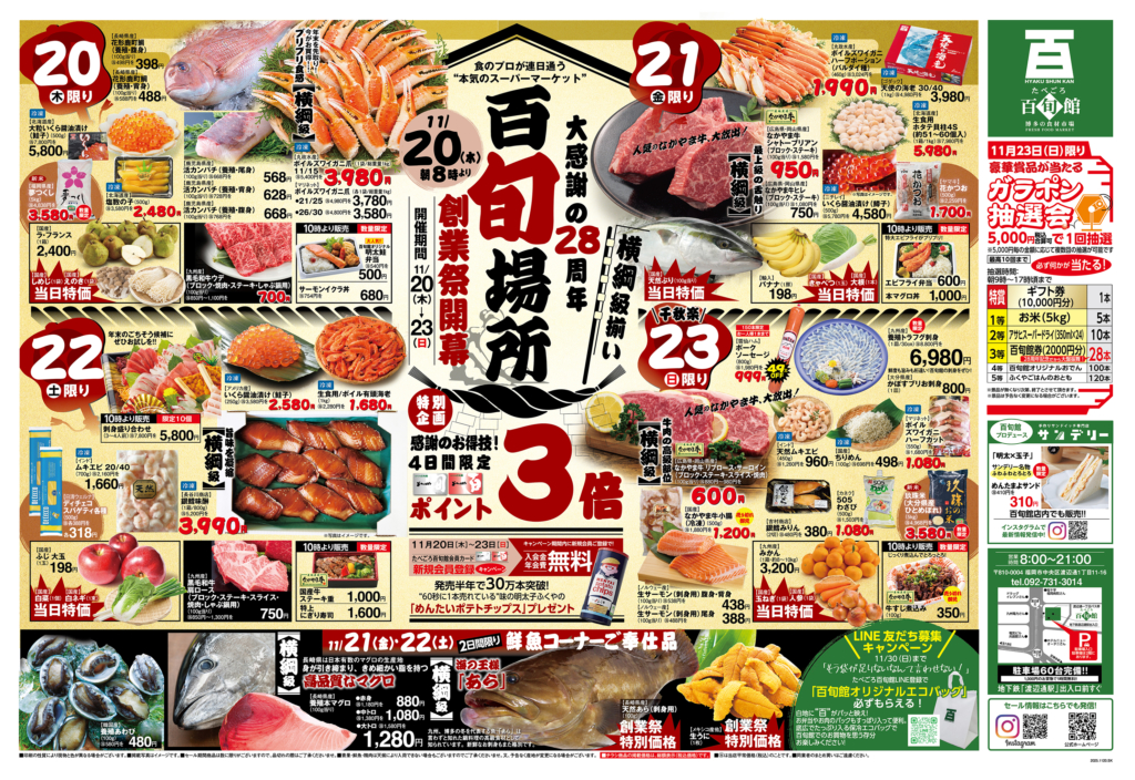 たべごろ百旬館はおかげさまで創業今年で28周年になります。これまでの感謝の気持ちを込めて、たべごろ百旬館 渡辺通本店では 2025年11月20日(木)〜 23日(日) の4日間、「創業祭」を開催いたします。年末の主役たちが特別特価で土俵入り。たべごろ百旬館の年に一度の大判振舞お見逃しなきよう、皆さまのお越しをスタッフ一同お待ち申し上げております!!