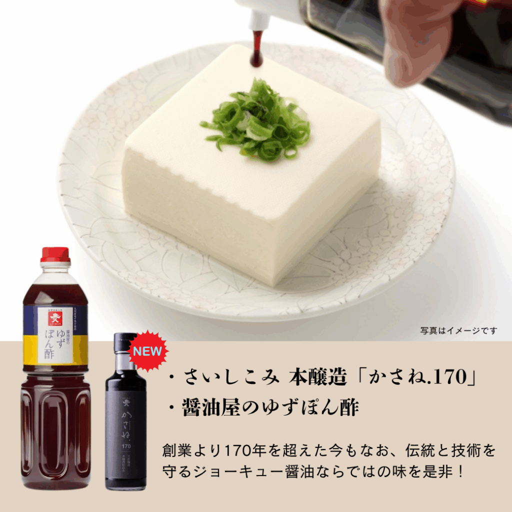 ・ 百旬館で販売中の絹豆腐を使用し「ゆずポン酢」「新発売/限定醸造記念醤油かさね.170」の試食