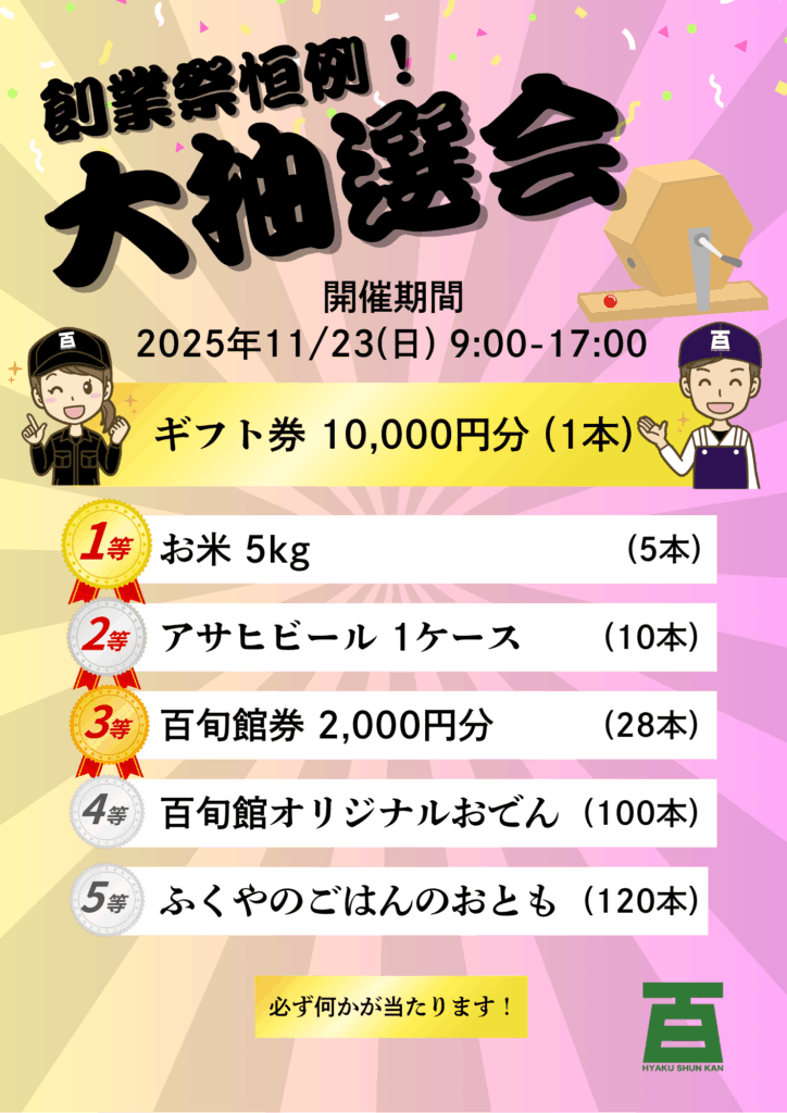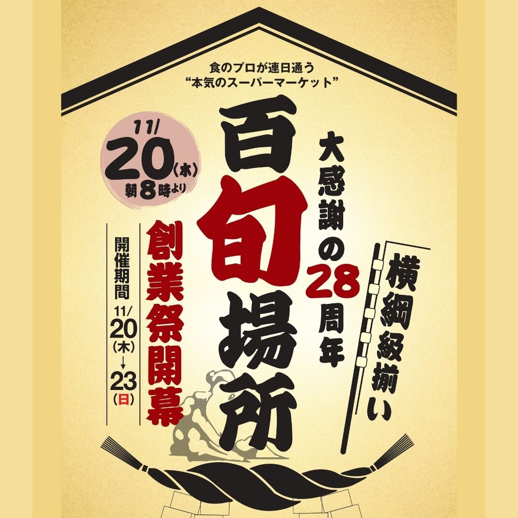 たべごろ百旬館はおかげさまで創業今年で28周年になります。これまでの感謝の気持ちを込めて、たべごろ百旬館 渡辺通本店では 2025年11月20日(木)〜 23日(日) の4日間、「創業祭」を開催いたします。年末の主役たちが特別特価で土俵入り。たべごろ百旬館の年に一度の大判振舞お見逃しなきよう、皆さまのお越しをスタッフ一同お待ち申し上げております!!