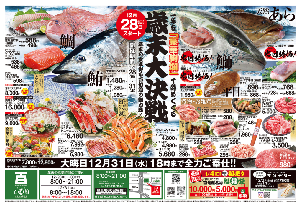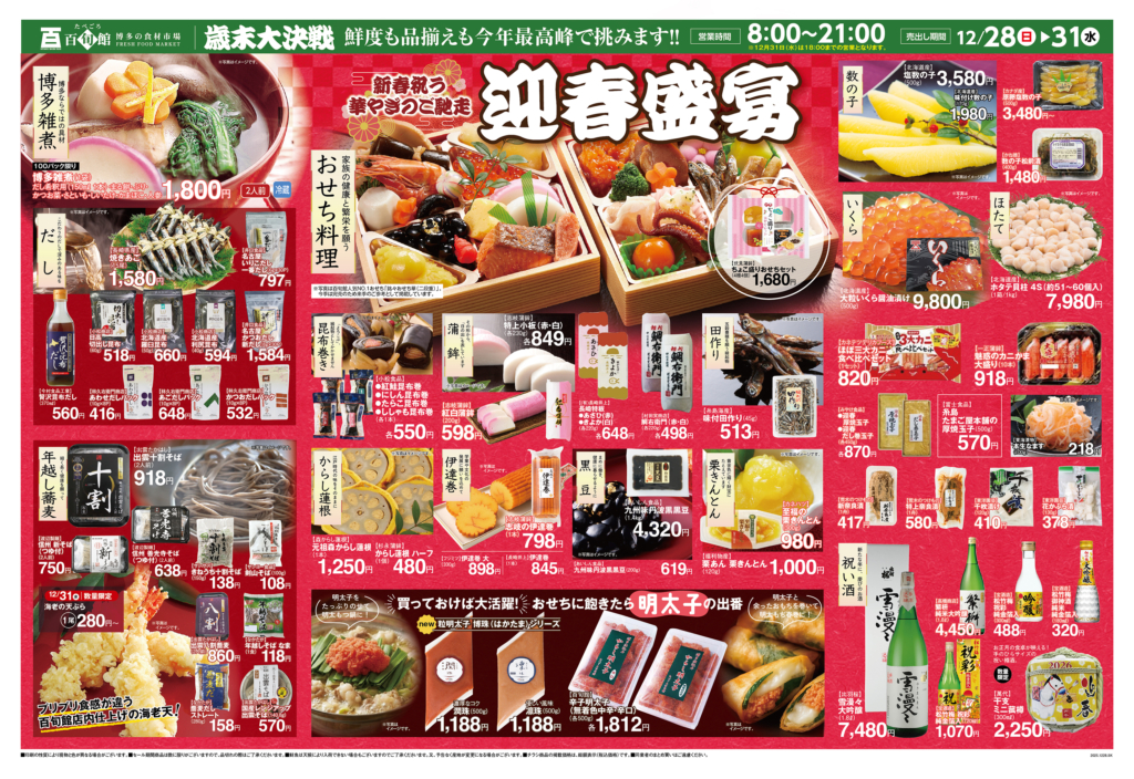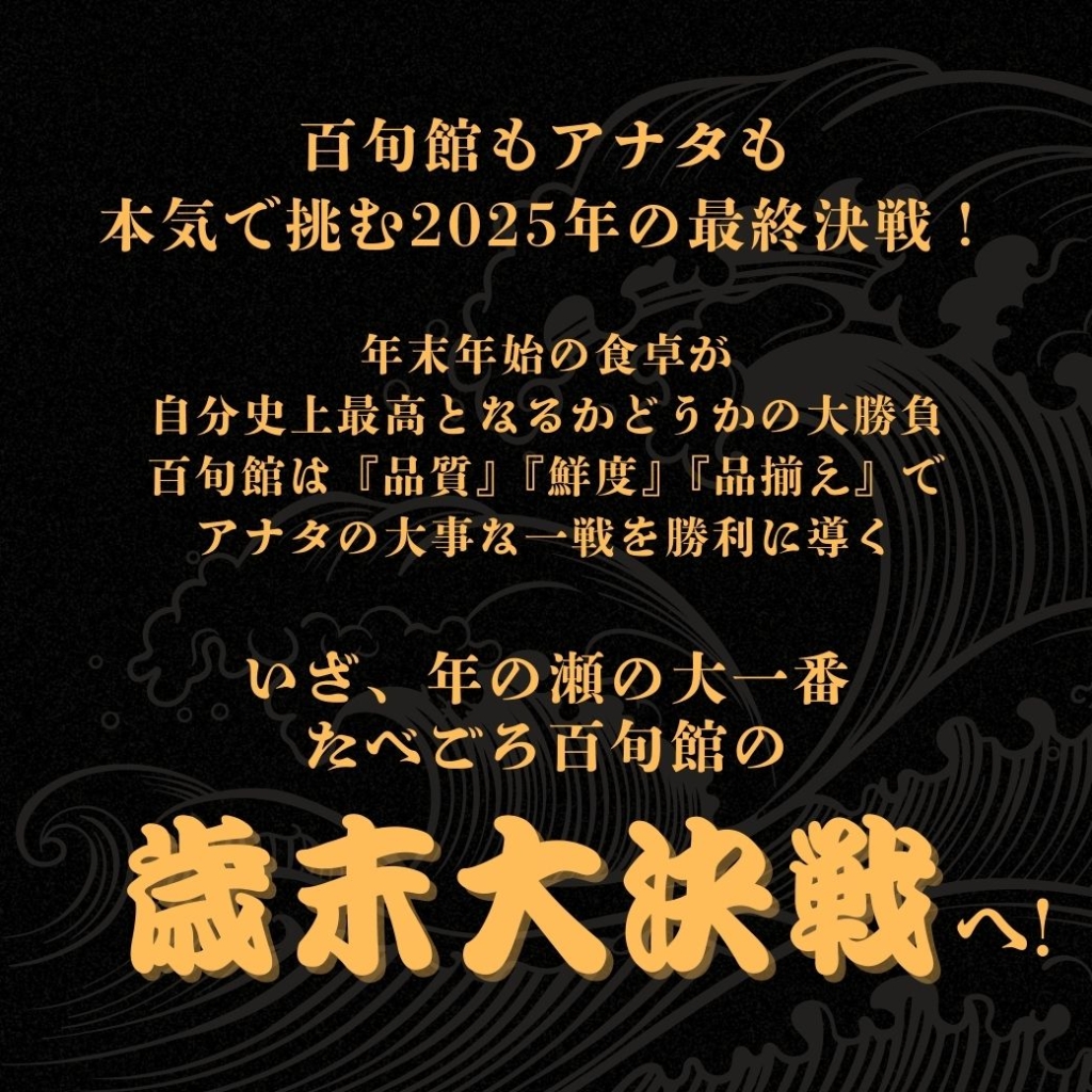 年末の食卓彩る百旬館の総力戦である、今年最後の営業4日間。皆さまには料理人御用達の間違いない食材たちで「豪華絢爛」に一年を締めくくっていただければ幸いでございます。毎年争奪戦となる商品もございますので、ご購入はお早めに。