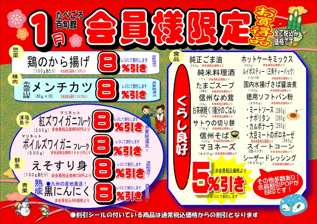 当店ではポイント会員様限定で、毎月の月替りでお買い得商品を限定特価で販売しております。店内で展示中の会員割引POPが目印です!たべごろ百旬館ポイントカードを忘れずにご持参の上、どうぞお得にお買い物をお楽しみください!