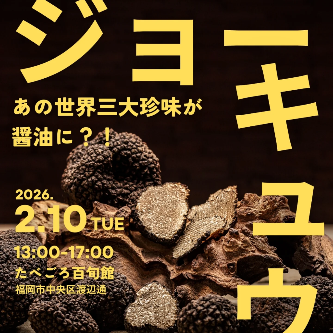 1855年(安政2年)創業以来、福岡、大名の地で170年の永きに渡って伝統の技術を守り、伝統の味を作り続けているジョーキュウ醤油さんが、あの世界三大珍味として知られるトリュフを使った、ほんのり甘くて芳醇なトリュフ風味の「トリュフ香る醤油」の試食販売を2/10(火) 13:00ごろより、たべごろ百旬館 渡辺通本店にて開催いたします。