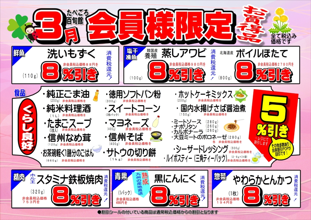 当店ではポイント会員様限定で、毎月の月替りでお買い得商品を限定特価で販売しております。店内で展示中の会員割引POPが目印です!たべごろ百旬館ポイントカードを忘れずにご持参の上、どうぞお得にお買い物をお楽しみください!