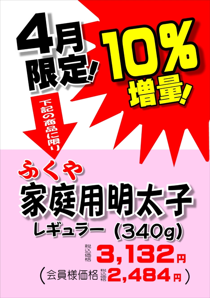 店内サービスカウンター横冷凍ケースにて販売しております、下記のふくや商品が増量中となっており大変お買得でございます。4月限定でございますので、ぜひこの機会にお買い求めください。